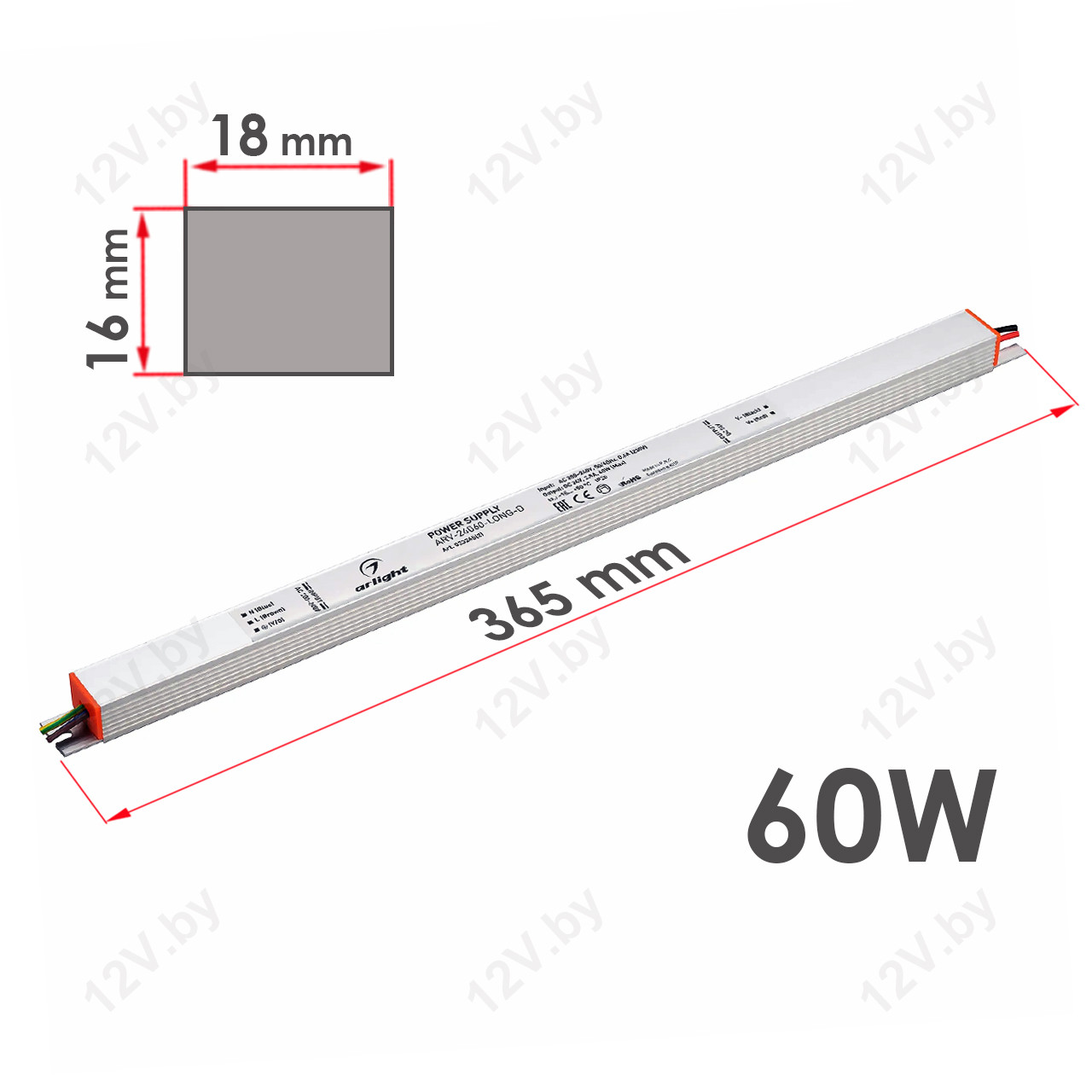 Компактный блок питания в алюминиевом ультратонком корпусе с гальванической развязкой для светодиодных лент, линеек, модулей и прочих потребителей. 60W IP20 220/24V. Габаритные размеры ДхШхВ, мм: 365х18х15