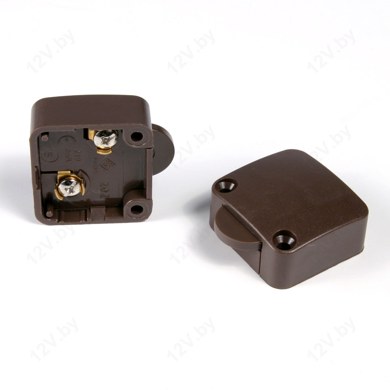 Мебельный концевой выключатель. Применение: включение/выключение подсветки в кухонных шкафчиках, полках, шуфлядах, выдвижных ящиках и другой мебели. Тип выключателя: нормально-замкнутый. Включение происходит при открывании двери шкафа, выключение, когда дверь закрывается. Монтаж скрытый/открытый. Цвет корпуса выключателя: коричневый. Размер: 32x34x14,8 мм.