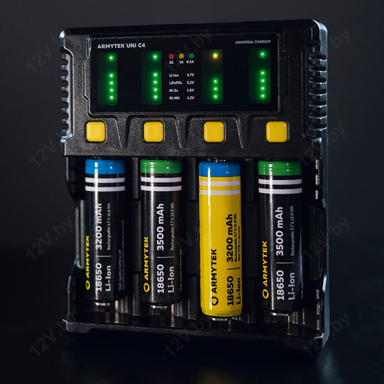 Uni C4 – универсальное зарядное устройство с интеллектуальным автоопределением типа аккумулятора, уровня заряда и оптимального тока. Одновременно заряжает до 4 аккумуляторов разного типа током до 2А. Отдельная кнопка для каждого канала обеспечивает простое ручное управление. Автомобильный адаптер в комплекте.
